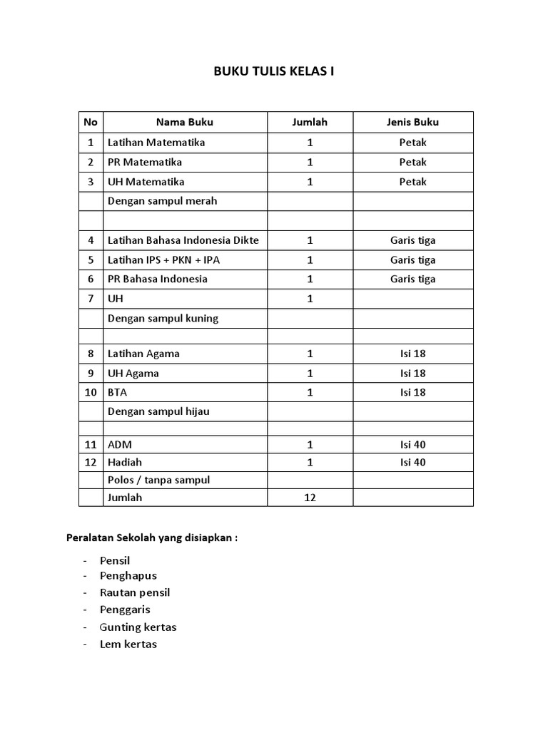Alat Tulis 1 Buku Tulis 2 Pensil 3 Bolpoin 4 Penggaris Banyak Yang
