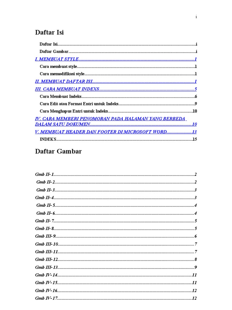 Nah daftar isi seperti inilah yang saya maksud lalu bagaimana cara membuatnya. Penulisan daftar daftar tersebut dapat dilakukan secara manual dengan menulis satu per satu sambil melihat posisi halaman tetapi hal tersebut akan membutuhkan waktu yang lama.