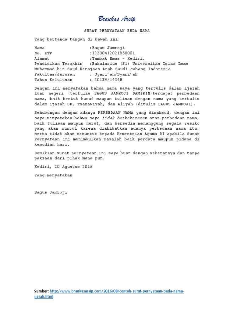 Surat Pernyataan Beda Nama Brankasarsip Com